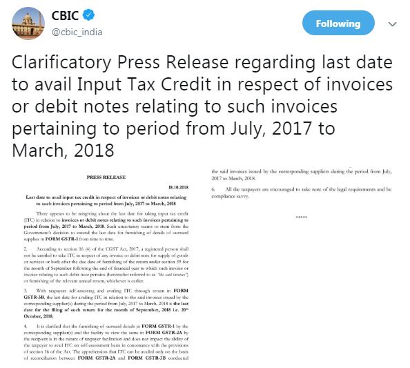3. With taxpayers self-assessing and availing ITC through return in FORM GSTR-3B, the last date for availing ITC in relation to the said invoices issued by the corresponding supplier(s) during the period from July, 2017 to March, 2018 is the last date for the filing of such return for the month of September, 2018 i.e. 20th October, 2018.