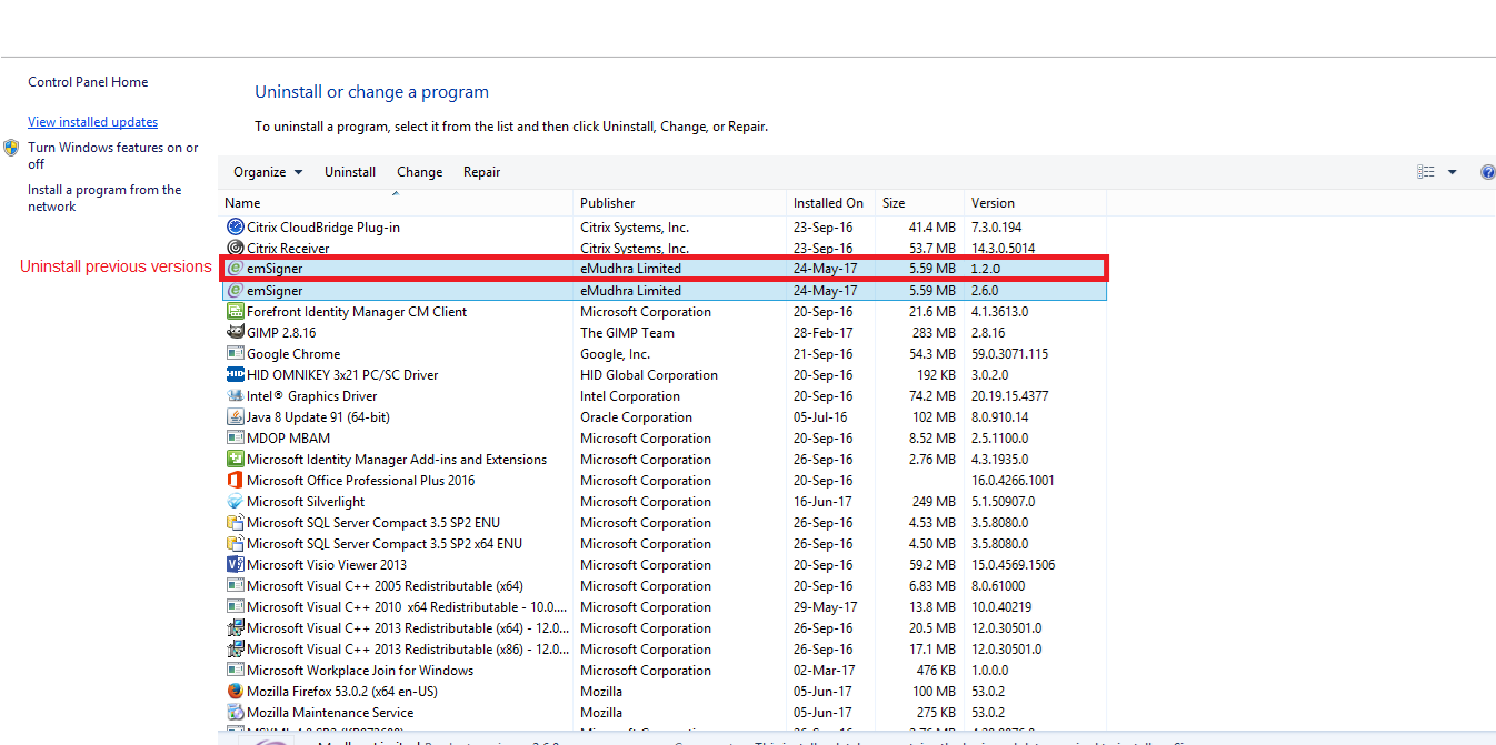 Note: Go to Control Panel > Program and Features to check the version of emSigner. In case the emSigner version is 1.2, you need to uninstall this version and install the emSigner v2.6.