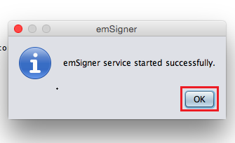 5. If emSigner is started successfully, below message is displayed. Click the OK button.