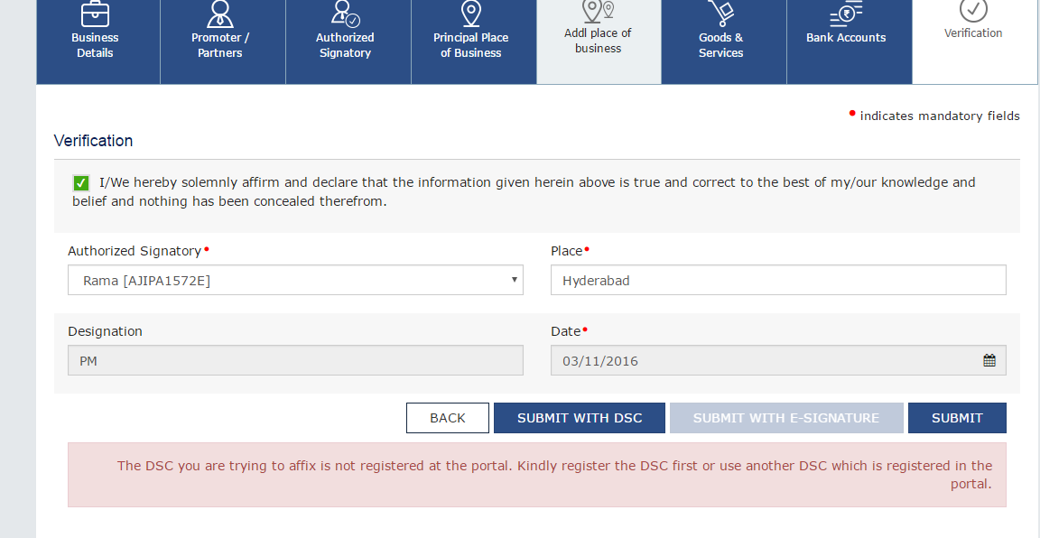 6. I am facing the error “The DSC you are trying to affix is not registered at the portal..”. What should I do?