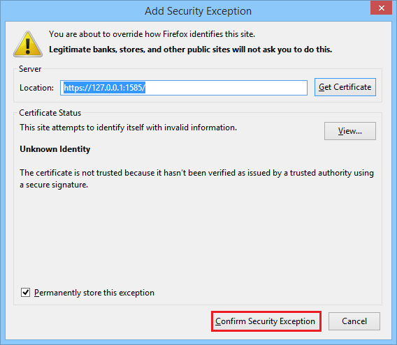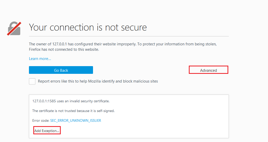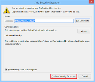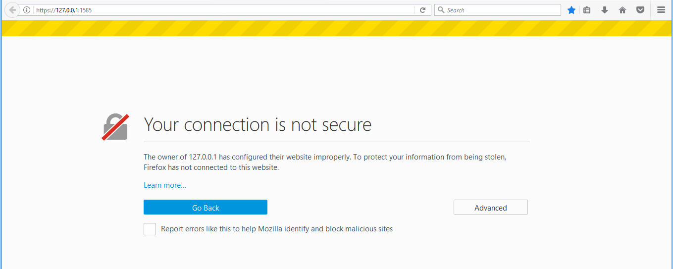 3. Type the url https://127.0.0.1:1585 in Mozilla Firefox browser.